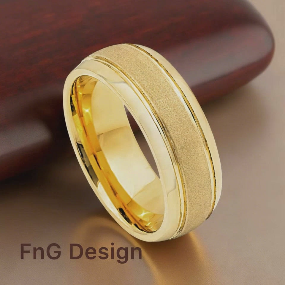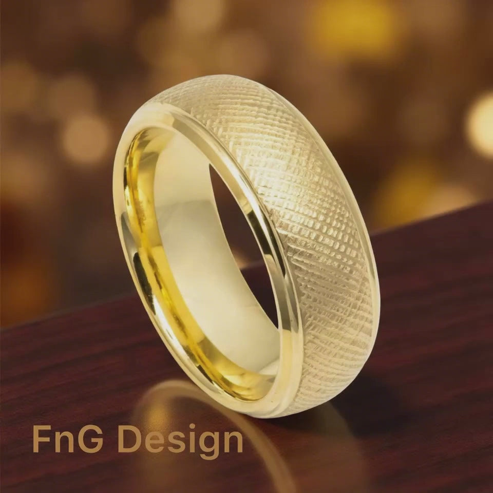 Gold Tungsten Carbide 8mm ion Plating Domed Sandstone Center Texturized Grooved hi-Polished Smooth Edge