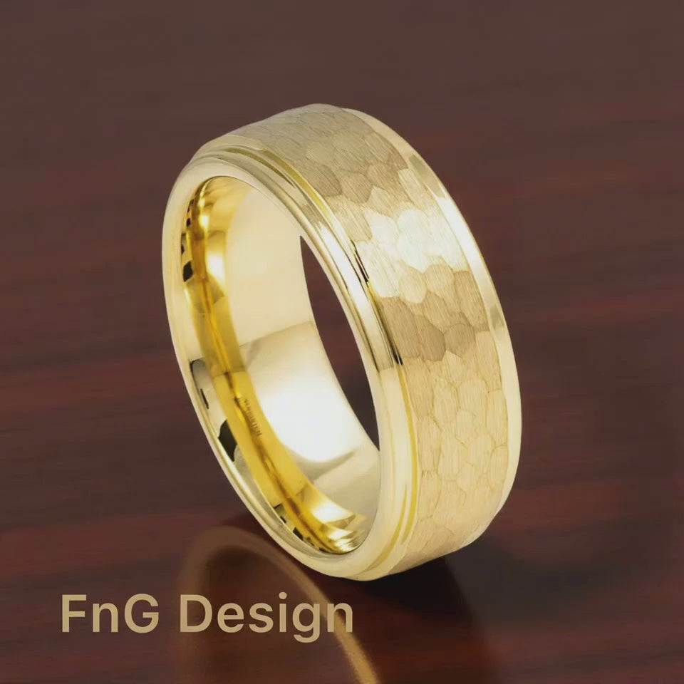 Gold Tungsten Carbide 8mm ion Plating Flat Hammered Finished hi-Polished Stepped Edge Ring