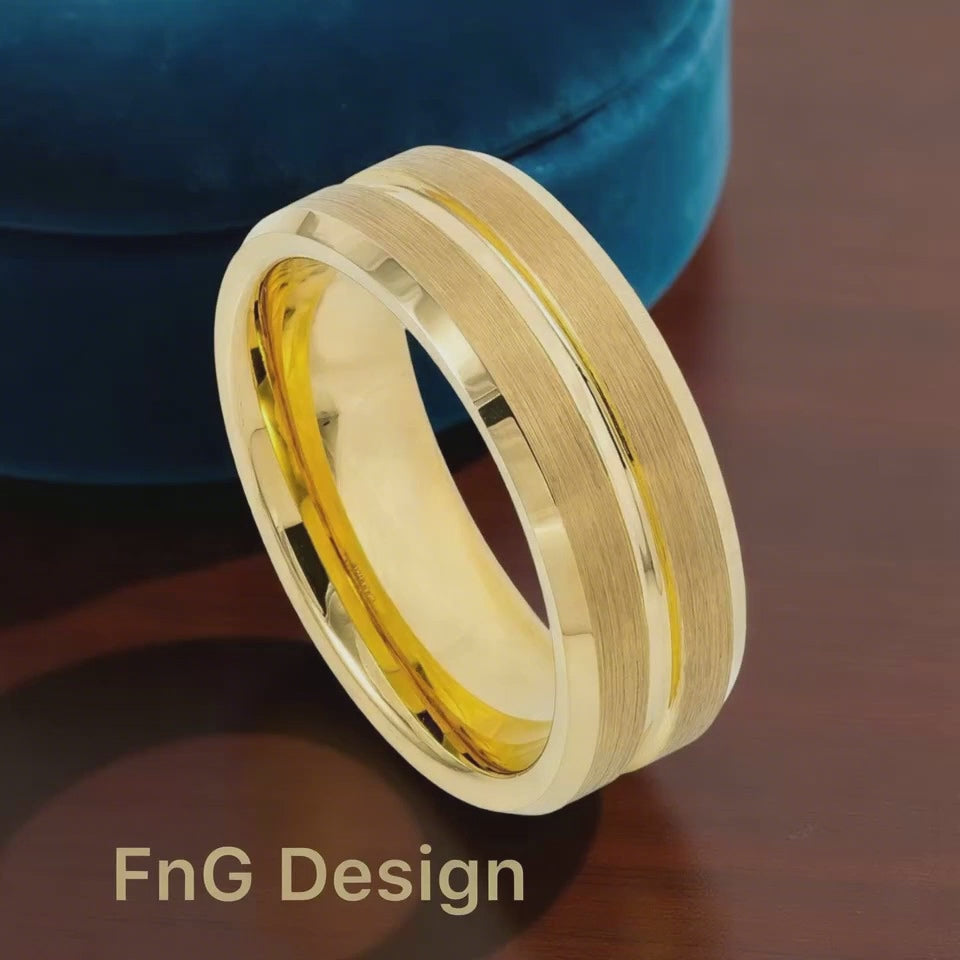 Gold Tungsten Carbide 8mm ion Plating Flat Brushed hi-Polished Groove & Bevel Edge Ring