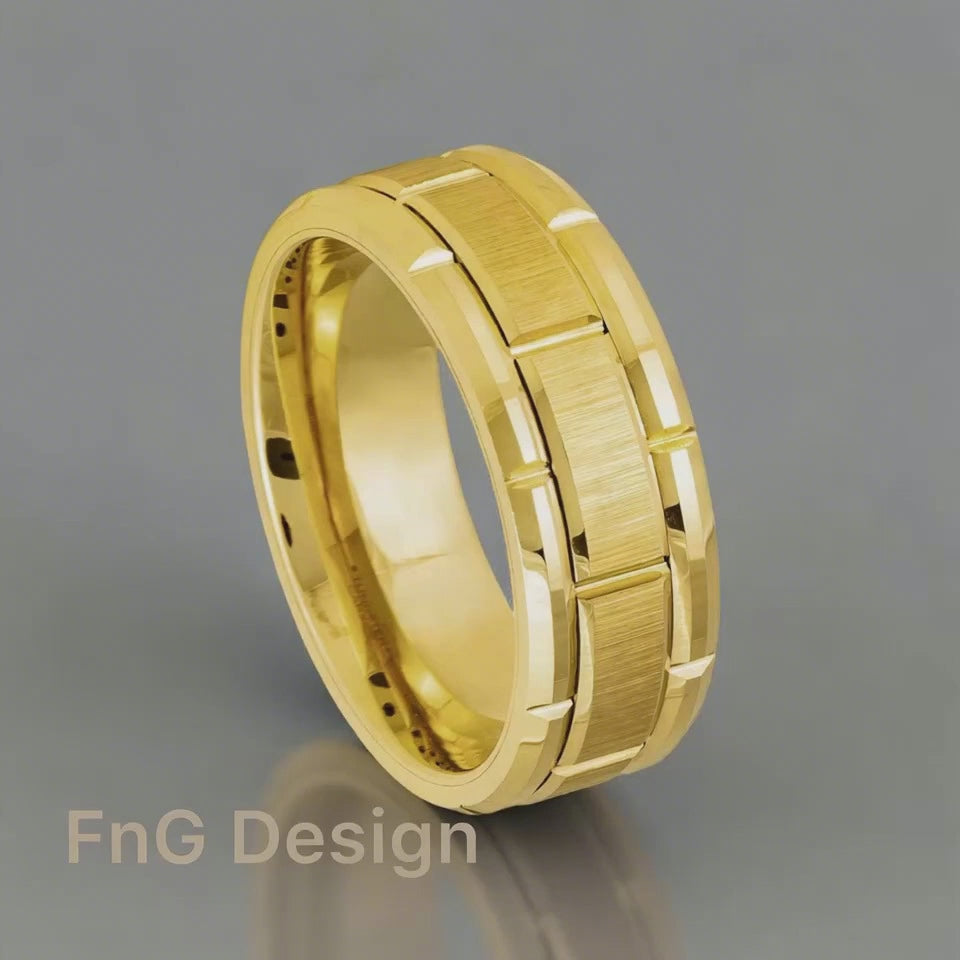 Gold Tungsten Carbide 8mm ion Plating Geometric Knurled Patterns hi-Polished Ring Double Bevel Edges