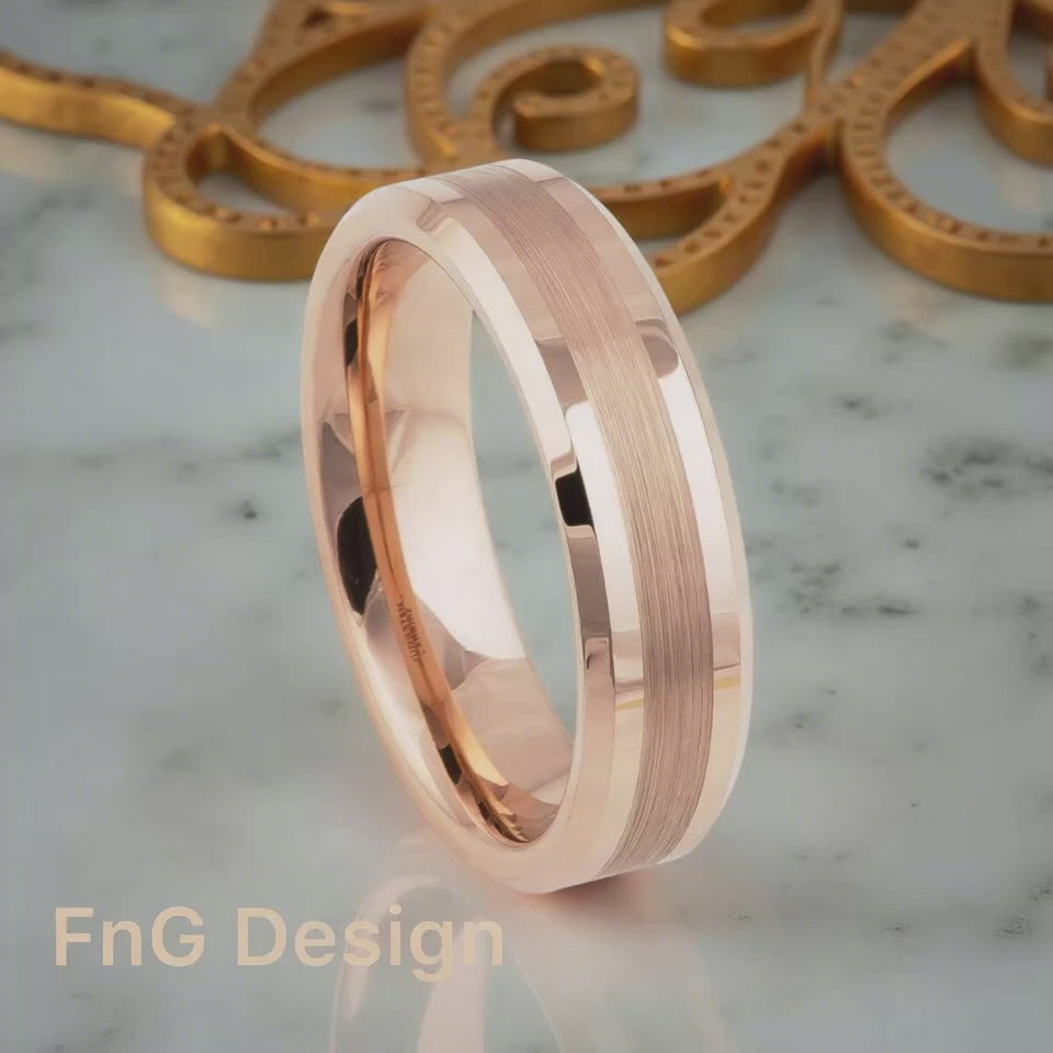 Rose Gold Tungsten Carbide 6mm ion Plating Flat Brushed Center hi-Polished Pipe Beveled Edge Ring