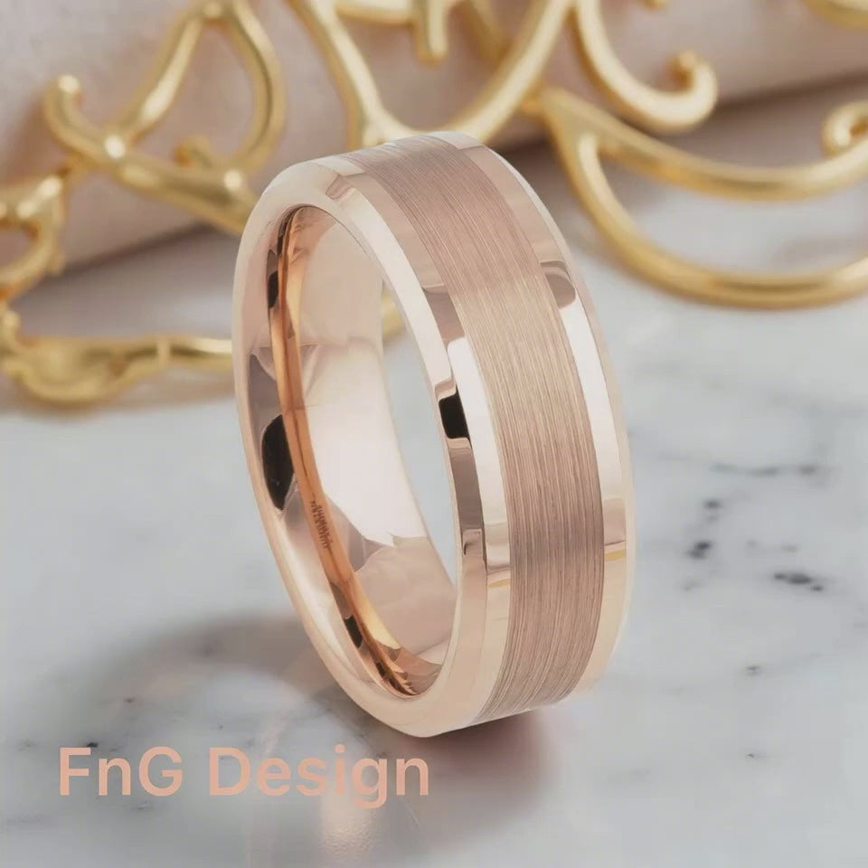 Rose Gold Tungsten Carbide 8mm ion Plating Flat Brushed Center hi-Polished Pipe Beveled Edge Ring