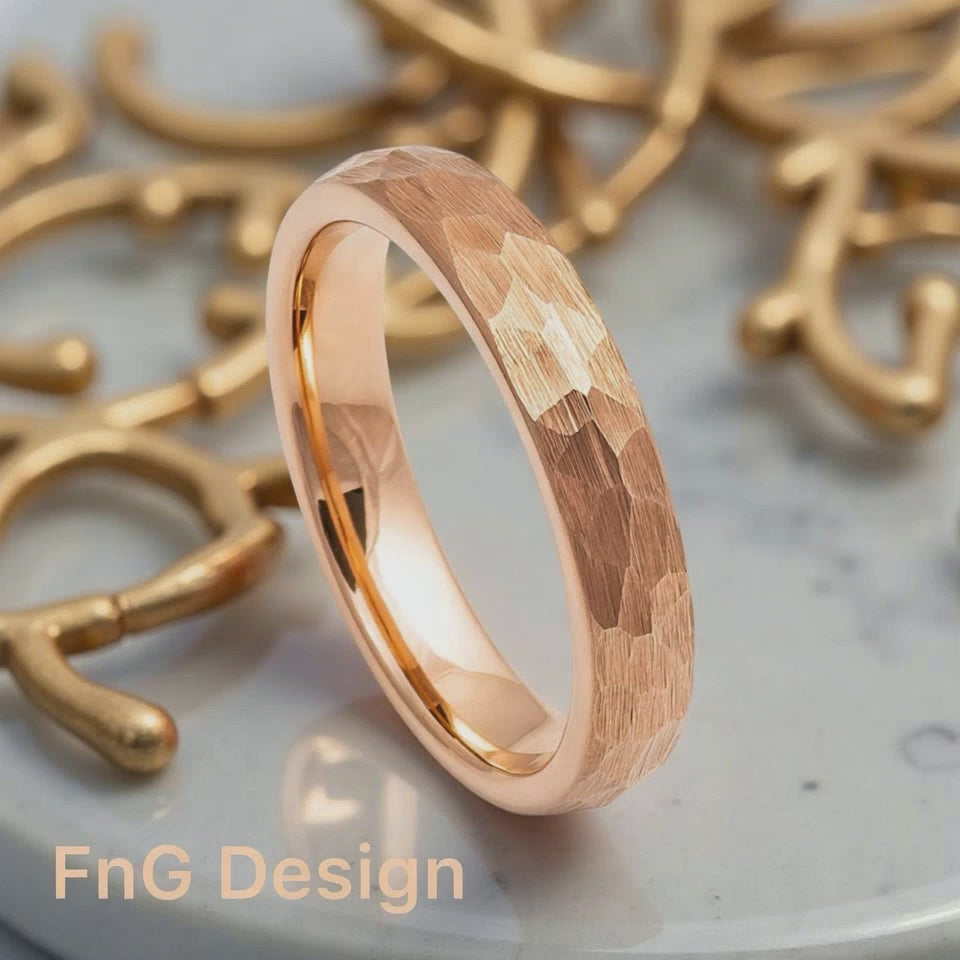 Rose Gold Tungsten Carbide 4mm ion Plating Dome Hammered Brushed Pipe-Cut Ring