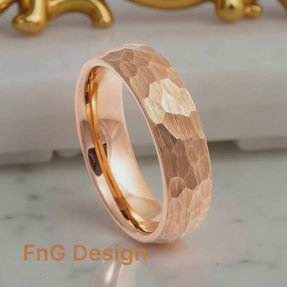 Rose Gold Tungsten Carbide 6mm ion Plating Dome Hammered Brushed Pipe-Cut Ring