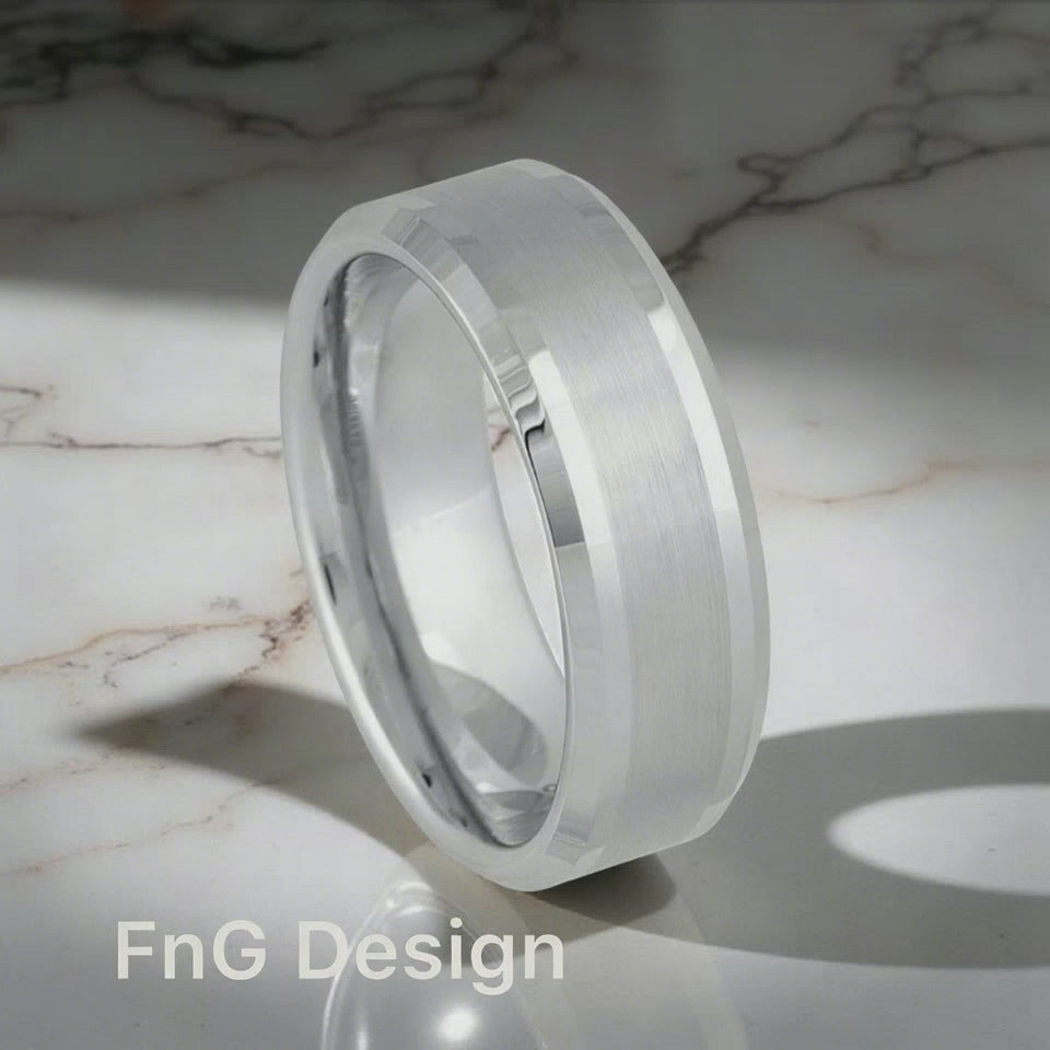White Tungsten Carbide 8mm ion Plating Flat Beveled hi-Polished Center Brushed Finish Ring
